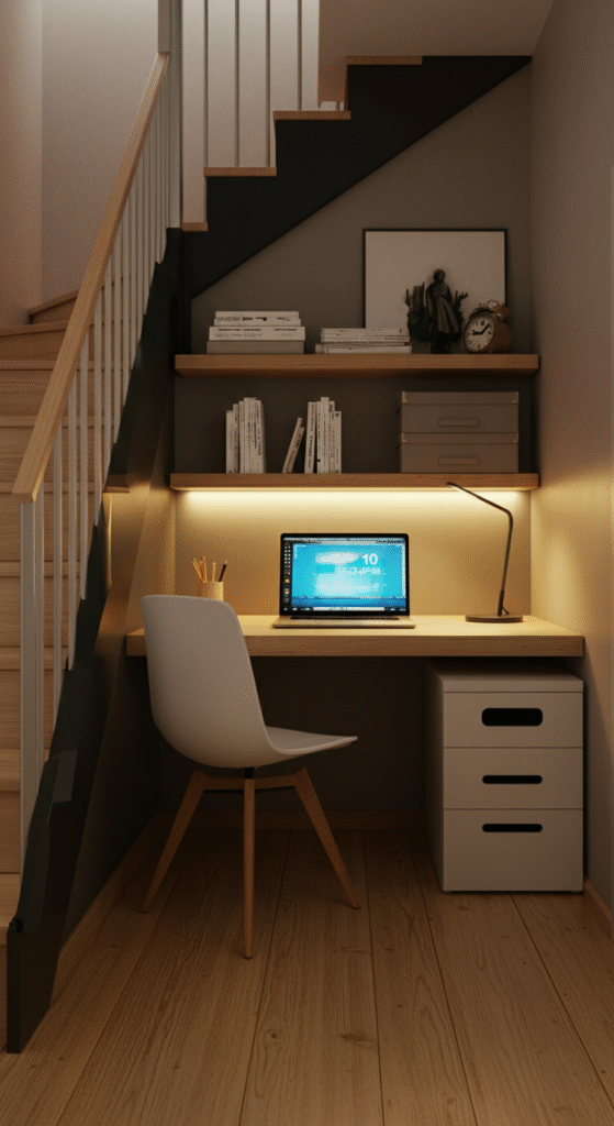 5. Scandi-inspired Home Office Under the Stairs