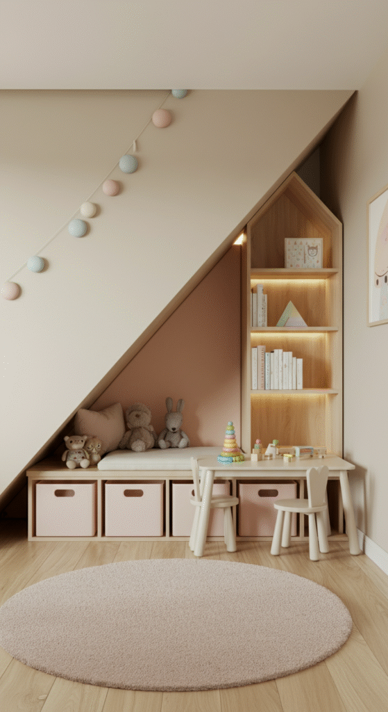 Transform the under-stairs area into a whimsical play zone for your children. Opt for soft textures, a small play rug, and storage bins to keep the area organized and clutter-free.