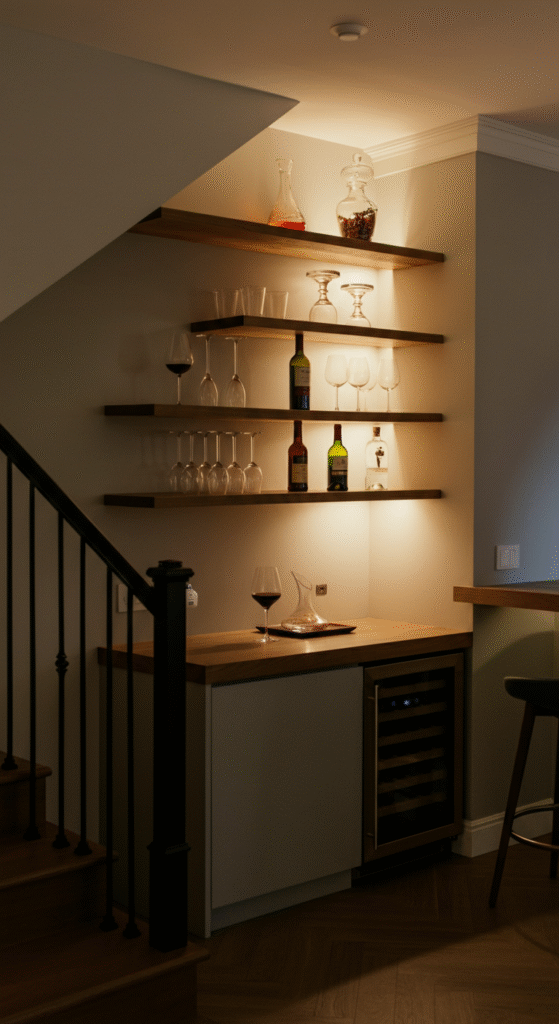 Key Elements: Floating shelves, wine racks, a small bar cart, and low lighting.