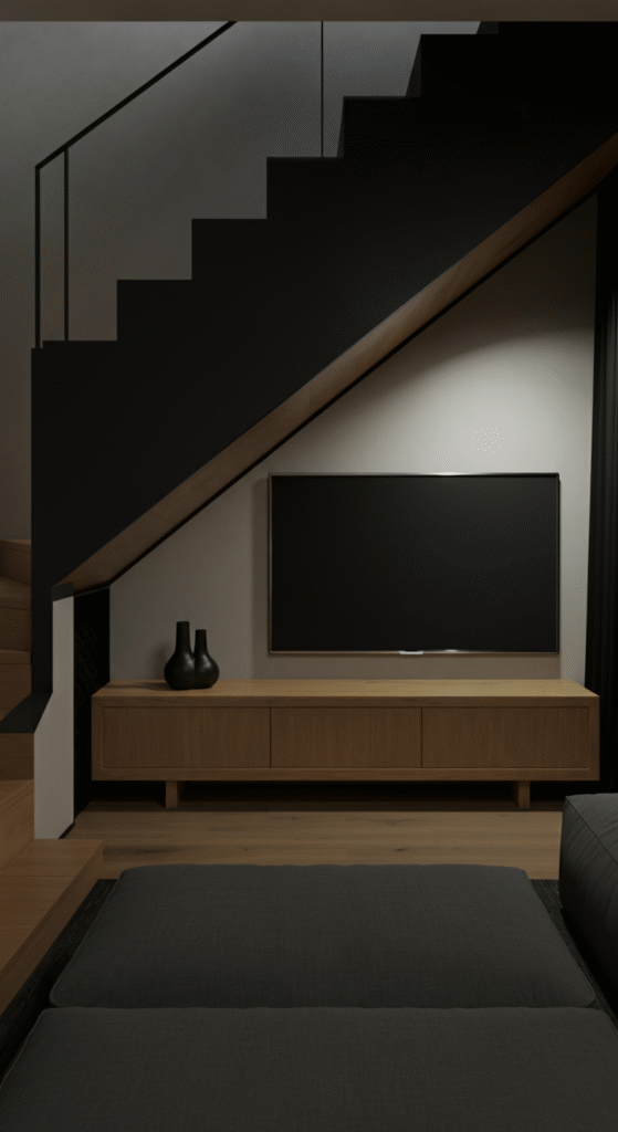 The under-stairs area can also double as a compact home theater. Install a sleek media console or entertainment unit with built-in storage. Position a flat-screen TV and add soft, Scandinavian-style seating. For an even cozier touch, add dim lighting and blackout curtains, creating the perfect atmosphere for movie nights.