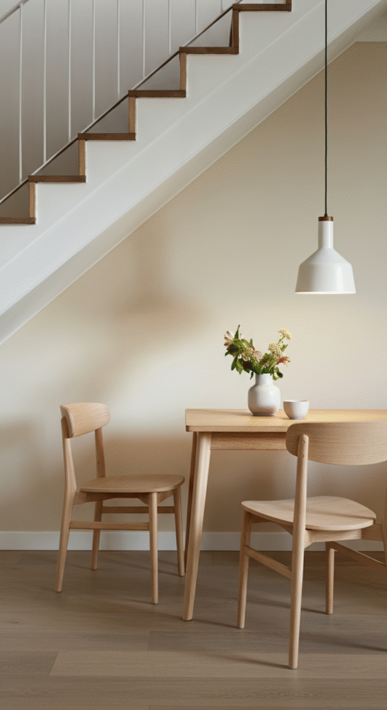 A small Scandinavian dining table with minimalist chairs creates an inviting setting for meals with family or friends. You can also add subtle décor pieces like candles or simple flowers to elevate the look.