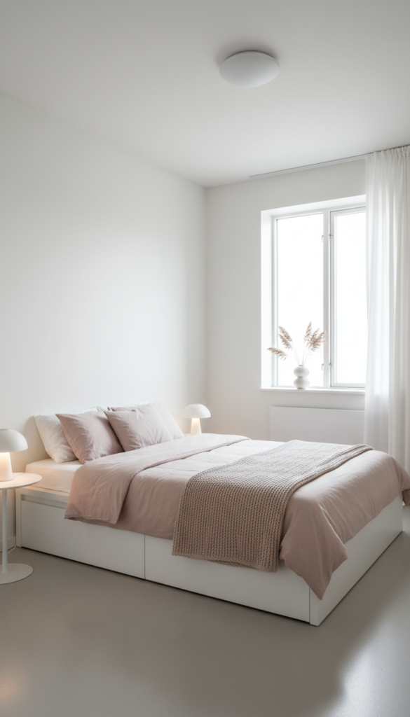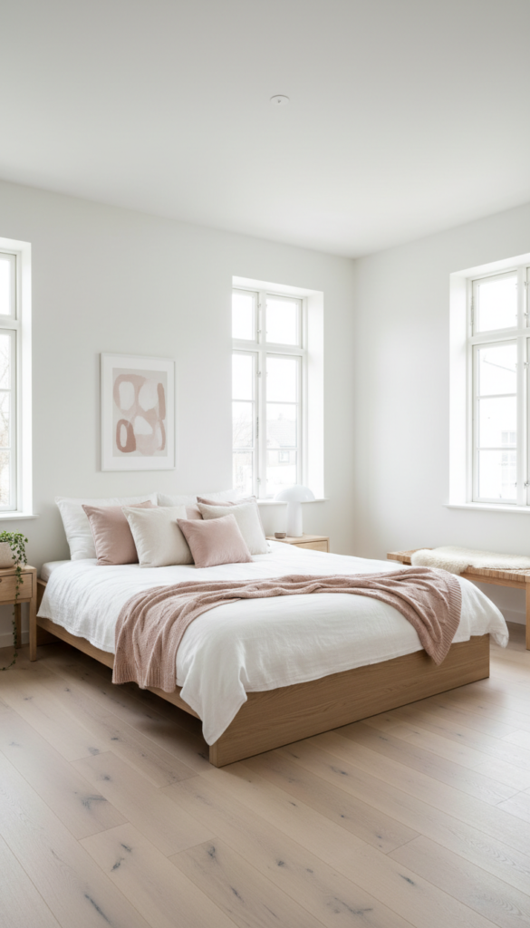 Scandinavian design is known for functionality and simplicity, typically relying on white, grey, and wood. However, adding soft pink (often called “Scandi pink”) warms up the cool Nordic palette. This look is about “hygge”—creating a cozy, contented feeling through simple furnishings and warm textiles.