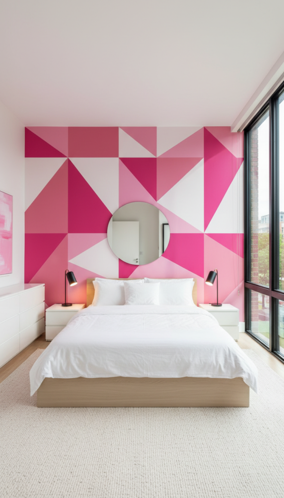 For those who prefer structure and boldness, a contemporary geometric aesthetic uses shapes to break up the softness of the pink. This style often uses color-blocking techniques or angular furniture to create visual interest. It’s a modern take that feels fresh and energetic rather than overly soft or sleepy.