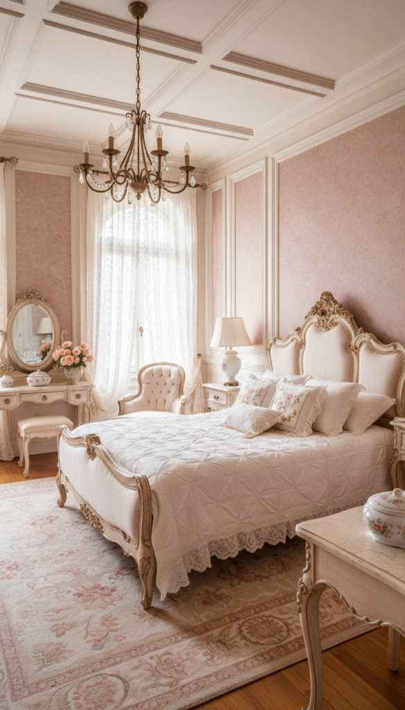 Similar to vintage glamour but with a rustic twist, French Provincial style features ornate carvings and soft curves. It feels effortlessly elegant and historically inspired. The pink here is often a pale rose, paired with creamy whites and distressed finishes that hint at a countryside chateau.