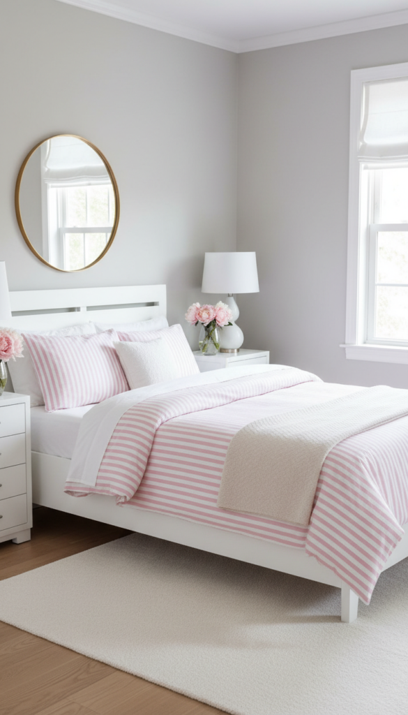 - Use toile patterns or subtle stripes in pink and white for bedding.