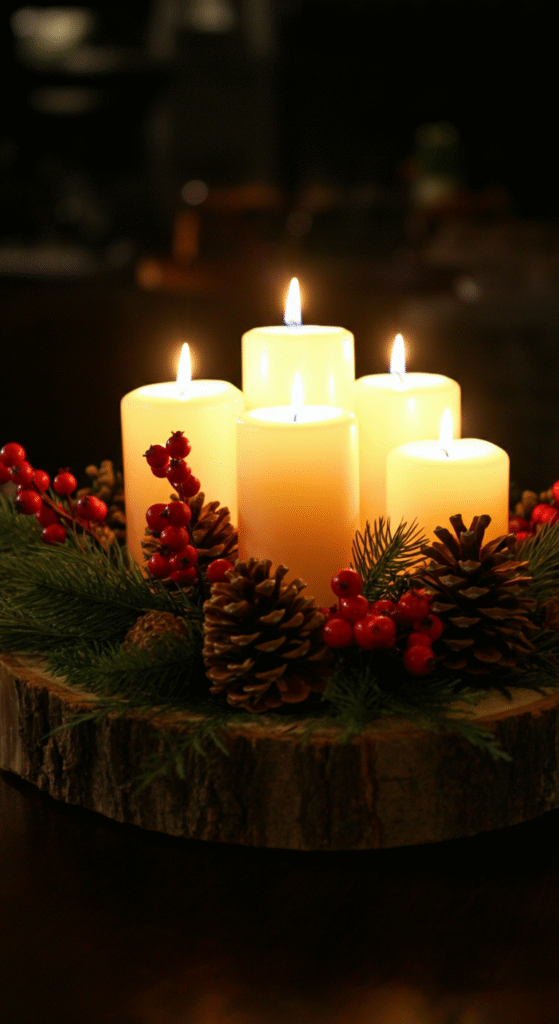 A charming and rustic centerpiece can easily be made using natural materials. Start with a large wooden slice as the base, and from there, let your creativity run wild. You can layer it with candles, small pinecones, and festive red berries for a warm and inviting look.