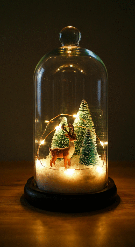 Fill a glass dome or jar with faux snow, small figurines like trees or reindeer, and glitter. Add battery-operated fairy lights for an extra magical effect.