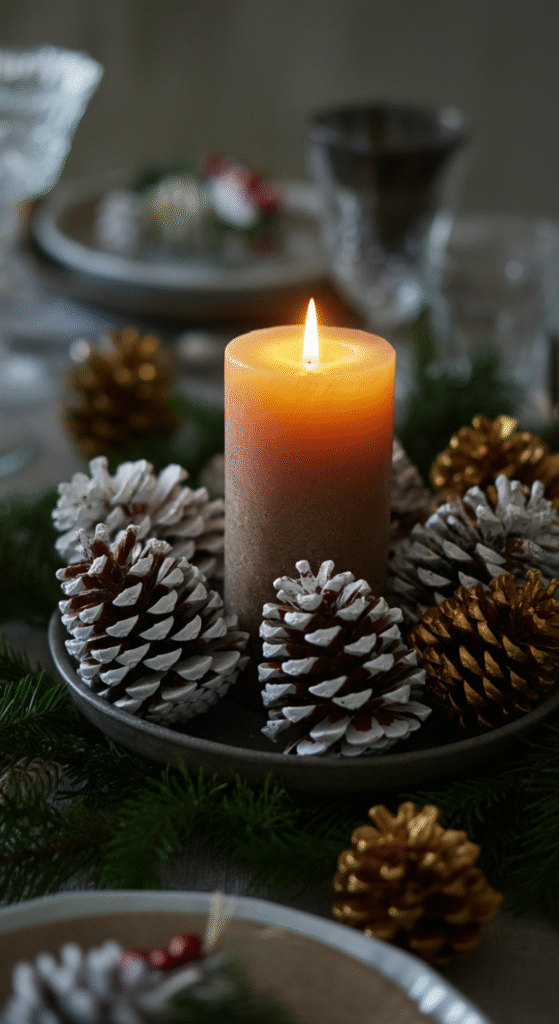 A simple and elegant way to bring the essence of Christmas to your table is by combining pinecones and candles. Collect a few pinecones, paint them with white or gold paint, and place them around a large pillar candle. The soft flicker of the candlelight paired with the earthy texture of the pinecones creates a warm, inviting atmosphere.