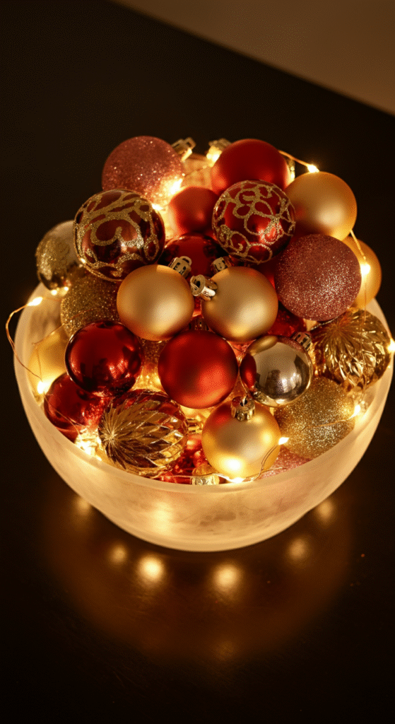For a modern and sleek centerpiece, try using a frosted glass bowl filled with a collection of colorful Christmas ornaments. You can mix different sizes and textures—matte, shiny, and glittery—for visual interest. To make the centerpiece even more magical, add a few battery-operated fairy lights around the base of the bowl.