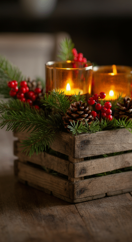 For a more rustic, farmhouse-inspired look, use a small wooden crate as the base of your centerpiece. Fill it with small evergreen branches, red berries, pinecones, and a couple of candles. The natural wooden texture of the crate adds a touch of warmth, while the greenery and decor give it that unmistakable holiday spirit.