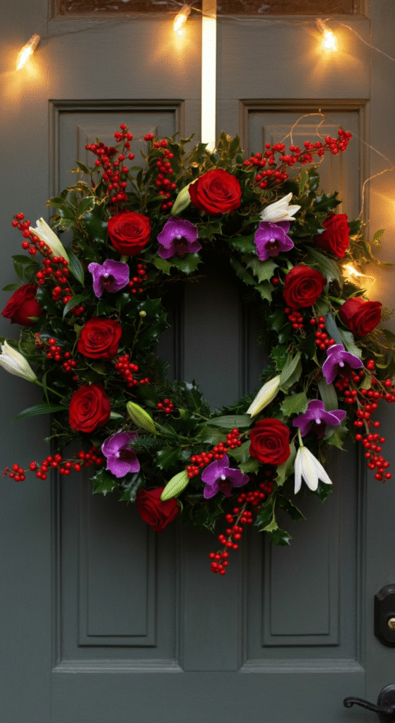 By mixing holly branches with red roses, white lilies, or deep purple orchids, you can create a wreath that not only adds a festive feel but also provides an elegant touch. Hang this unique floral wreath on your front door or above your mantel to impress your guests as they walk in.