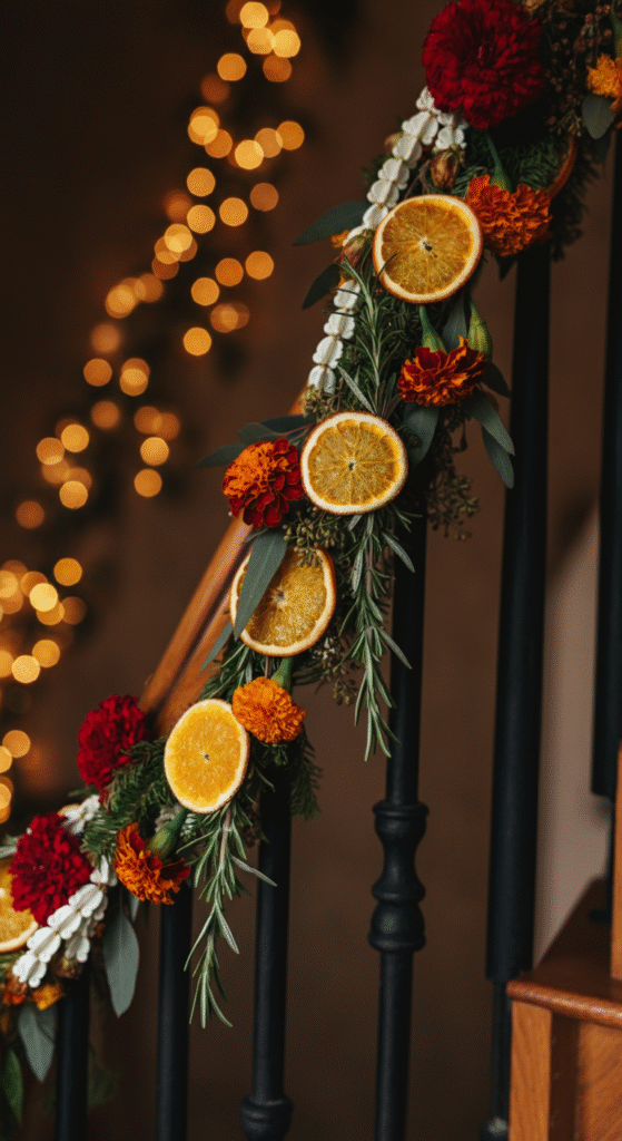 Combine vibrant orange slices, sprigs of rosemary, and fresh flowers like marigolds or jasmine. Drape this fragrant garland over your mantel, stair railing, or windowsill to infuse your home with both holiday charm and the refreshing scent of citrus.