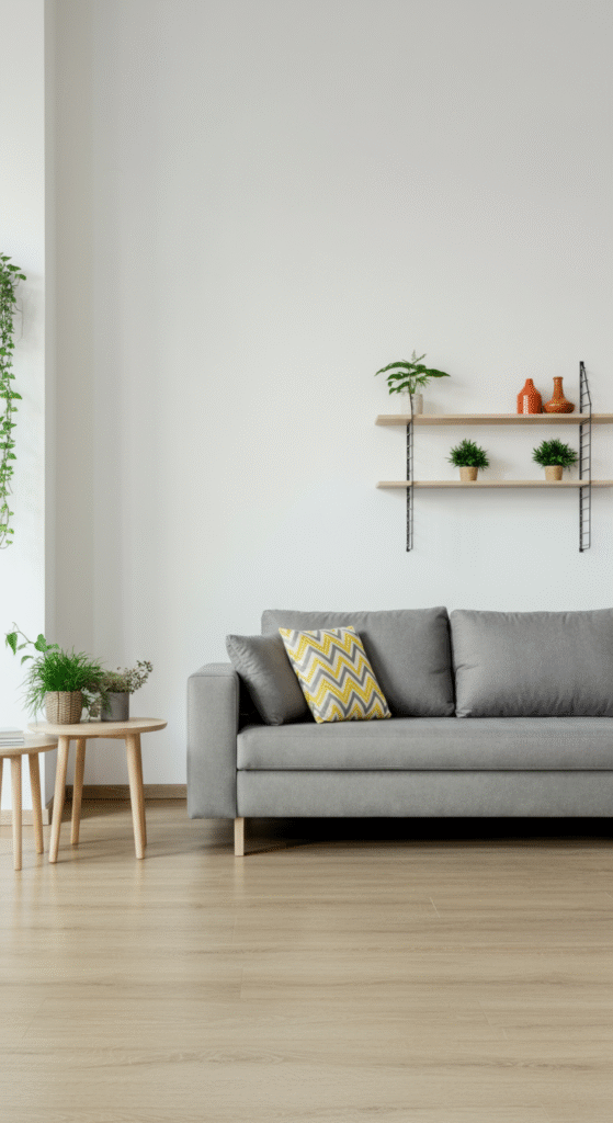 Imagine a spacious living room with a grey couch as the centerpiece, surrounded by white walls, light wood furniture, and a few potted plants. This design creates a light and bright environment, perfect for those who love a fresh, open, and welcoming space.