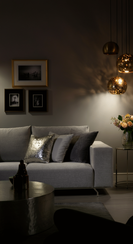 You can incorporate metallic elements through light fixtures, side tables, picture frames, or decorative objects like vases. The key is to use these accents sparingly so they don’t overpower the soft elegance of the grey couch.