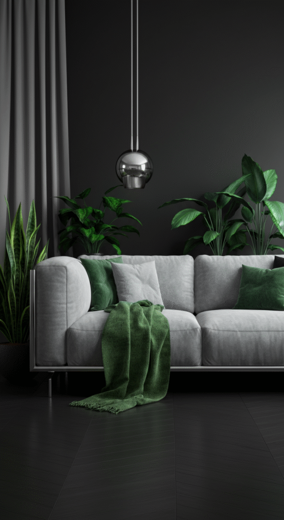 A sleek black coffee table, dark lighting fixtures, or black picture frames can complement the grey couch, giving your living room a polished, elegant vibe.