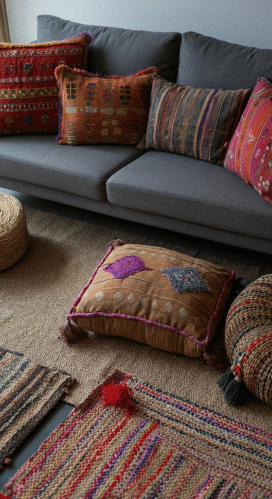 If you love a free-spirited, eclectic style, a bohemian-inspired living room with a grey couch is the perfect way to embrace vibrant colors, textures, and patterns. Think layers of colorful throws, a mix of patterned cushions, and wall art that tells a story.
