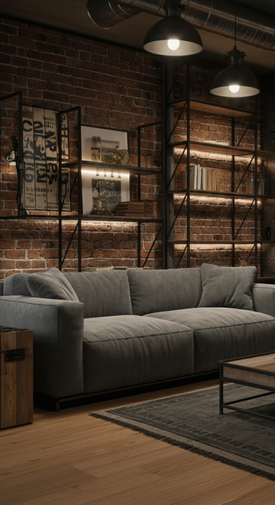 The industrial style celebrates raw materials and utilitarian design, and when paired with a comfortable, neutral-toned grey couch, it creates a space that’s both functional and stylish.