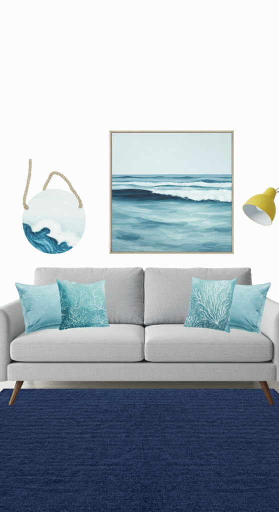 Pair your grey couch with a light blue rug, navy cushions, or blue artwork to evoke the calming effect of the ocean. This design works particularly well for those who live by the sea or want to bring the peaceful vibes of the beach indoors.