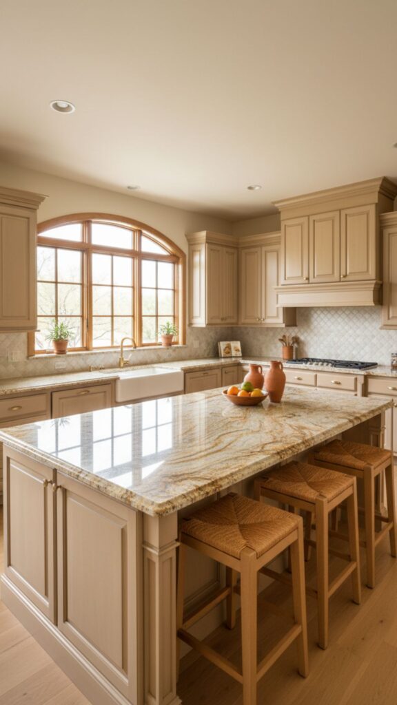 Golden or honey-toned granite, such as Giallo Ornamental, anchors a room with warmth. It pairs beautifully with creamy cabinetry and brings a sun-baked desert feel to your space.