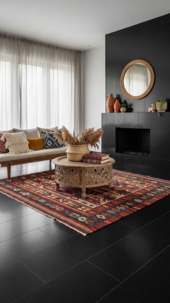 - Incorporate colorful Kilim rugs to soften the darkness.