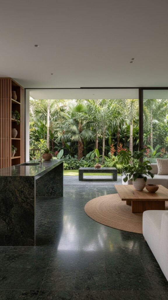 Embrace the “jungle boho” aesthetic with granite that features deep green hues. Verde Butterfly or similar green stones connect the indoors with the outdoors, acting as a neutral backdrop for lush greenery.