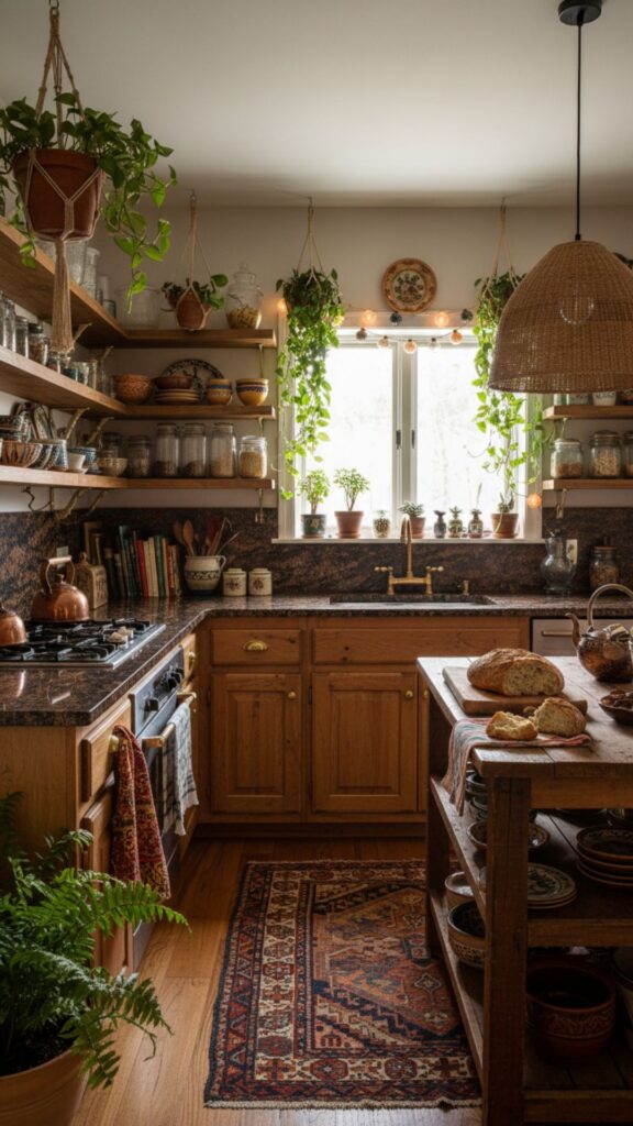 Natural wood tones, warm whites, creams, and earthy greens (like sage or olive) are the best cabinet choices to complement granite in a bohemian kitchen.