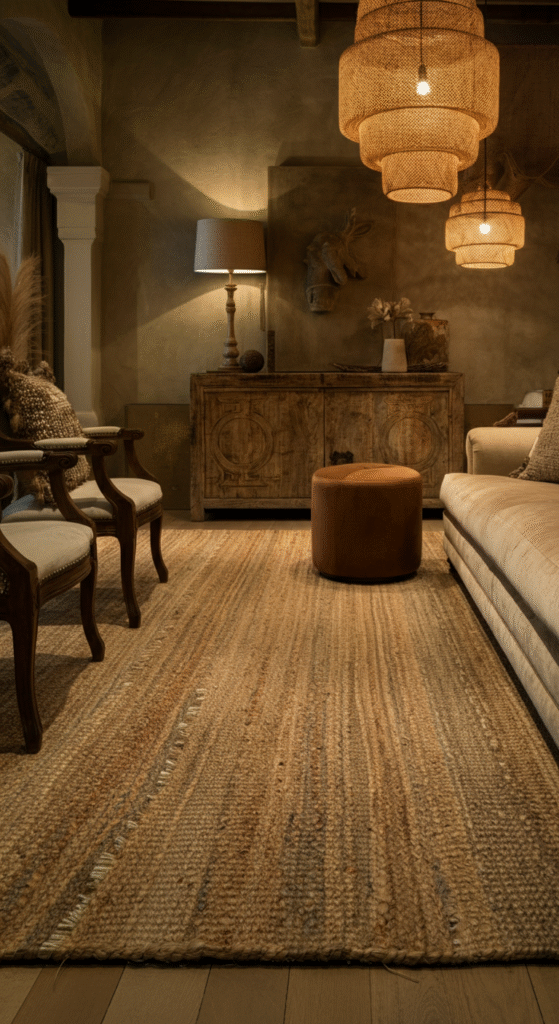 For a rich, textural experience, choose a jute rug that features layered materials. A combination of jute, cotton, and even leather can create a tactile surface that invites guests to touch and feel the rug. These textures create an opulent yet rustic look that is perfect for cozy living rooms with an inviting atmosphere.