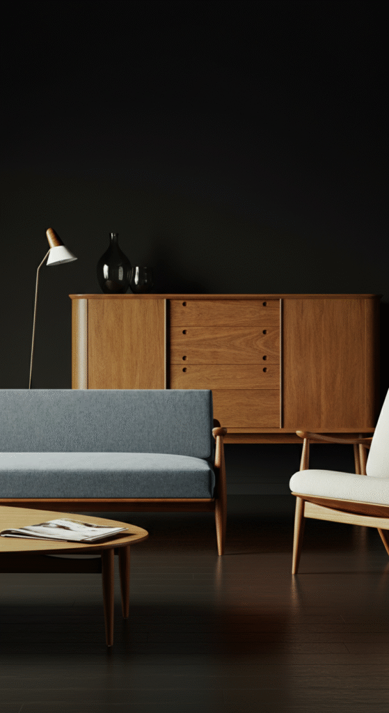 One of the hallmarks of Mid-Century Modern living rooms is furniture that stands out for its minimalist design and functionality. Think of sleek, low-profile sofas with clean lines, wooden legs, and angular shapes. These pieces give the room a sense of openness and can serve as conversation starters.