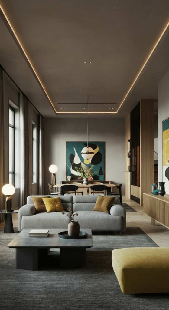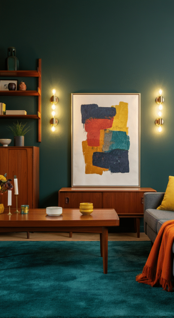 Mid-Century Modern living rooms often feature rich, natural wood tones like teak, walnut, and oak. These woods are perfect for creating warmth and texture in a space. The key is to mix these natural elements with bold accent colors—think mustard yellow, deep teal, or vibrant orange. These tones create a contrast that’s both playful and sophisticated.