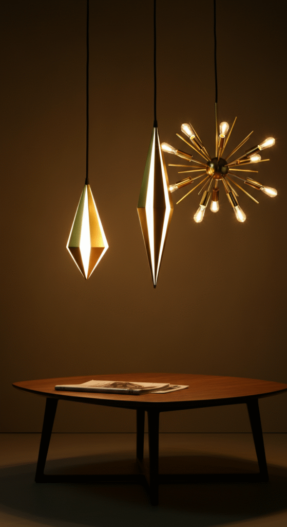 Lighting is one of the most impactful elements in any Mid-Century Modern living room. Geometric pendant lights and chandeliers with clean, angular shapes are staples of the style. Instead of opting for overly ornate lighting, keep things simple and functional while still making a statement.