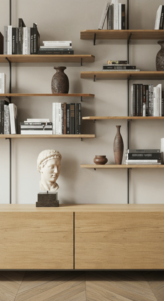 Mid-Century Modern design embraces the idea of open shelving, which promotes both function and beauty. Shelves made of natural wood or metal can display your favorite books, art pieces, or plants. The goal is to create a streamlined, minimalist storage system that doesn’t detract from the room’s spacious and airy feel.