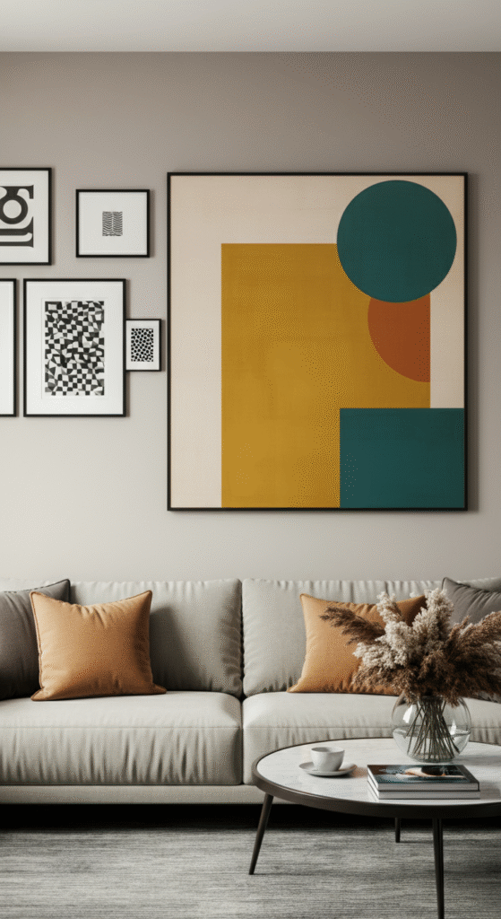 Incorporate oversized artwork or bold graphic prints to make a statement in your living room. Mid-Century Modern is known for its abstract and geometric patterns, so don’t be afraid to go big with your wall art. A large piece of abstract art can easily become the focal point of your living room.