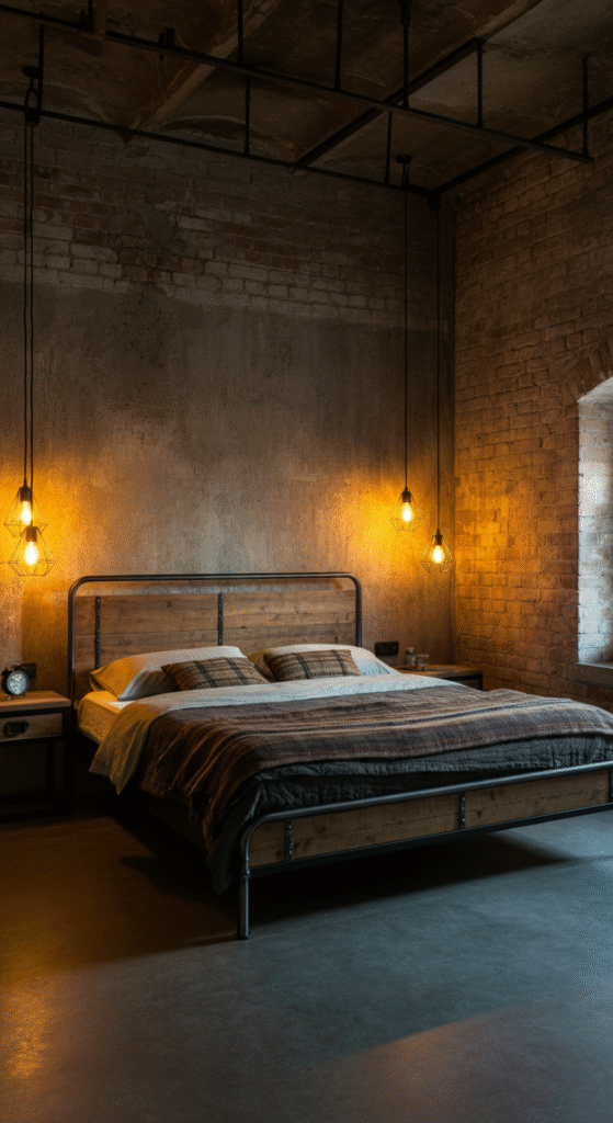 Pair your industrial king bed with soft bedding and vintage accessories like an old-fashioned desk lamp or a classic leather chair to balance the raw, rugged aesthetic.