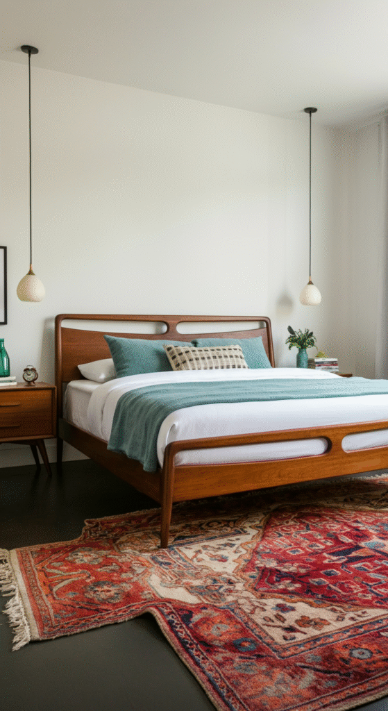 Add a pop of color with vibrant throw pillows or a retro-patterned rug to bring the room to life.