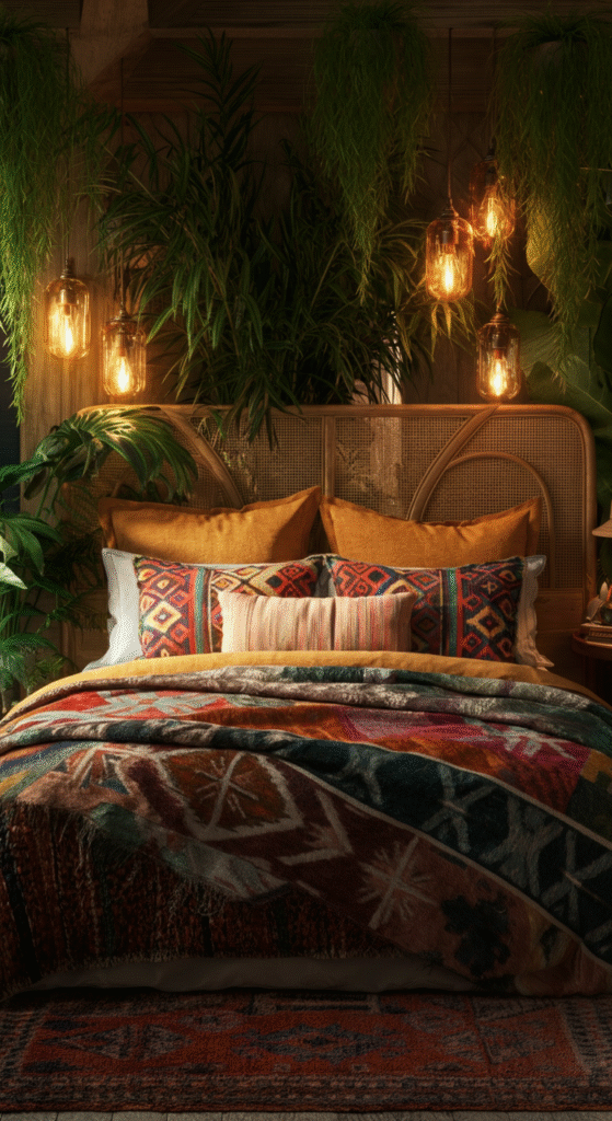 Pair your bed with an assortment of patterned rugs, vintage lamps, and greenery to enhance the eclectic, carefree vibe.