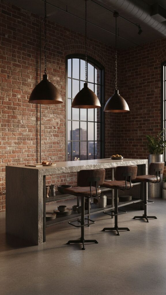 Think exposed brick, metal accents, and a bit of edge. Industrial chic counters often mix raw materials like concrete or stainless steel with warmer leather seating for a sophisticated, urban vibe.