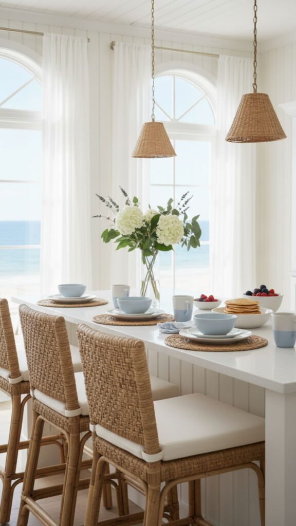 Light, airy, and full of blues and whites. A coastal breakfast counter feels like a vacation spot, utilizing rattan textures and soft hues to create a relaxed atmosphere perfect for morning pancakes.