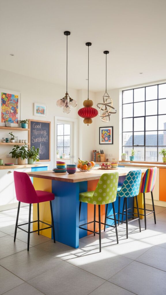 Who says kitchens have to be neutral? A colorful breakfast counter uses vibrant cabinets or brightly colored stools to make a massive statement. It’s energetic, fun, and shows off personality.
