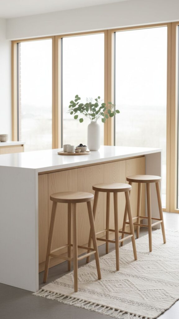 - Incorporate natural wood elements, either on the counter or the stools.