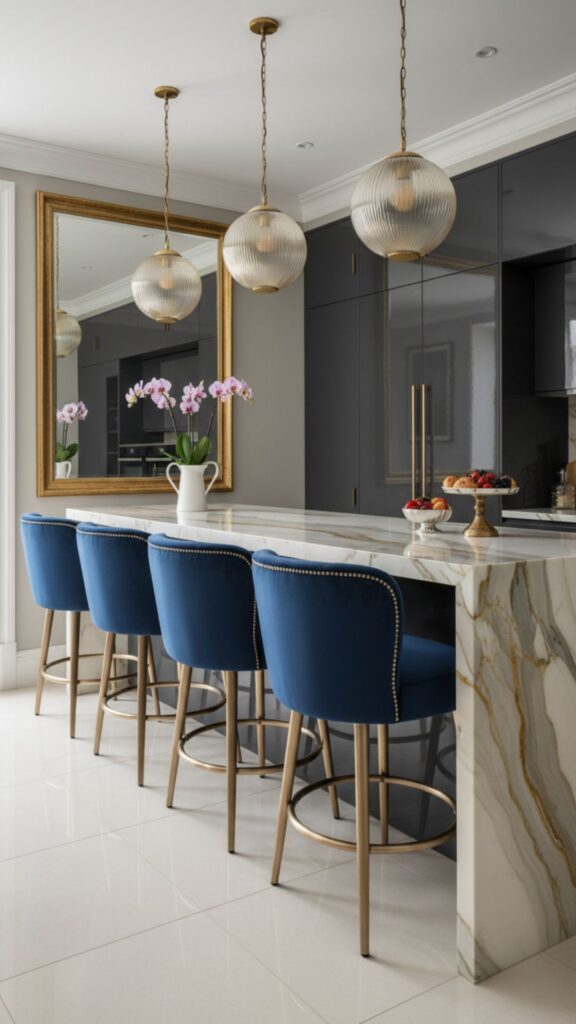 High shine, velvet, and gold accents. This style turns your morning coffee into a VIP experience. It’s all about luxurious materials and elegant finishes that catch the light.