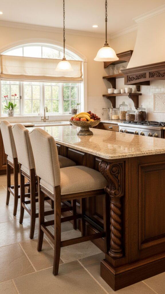 Timeless elegance that never goes out of style. Traditional counters usually feature detailed woodwork, corbels, and comfortable, substantial seating. It’s a sturdy, family-friendly look.
