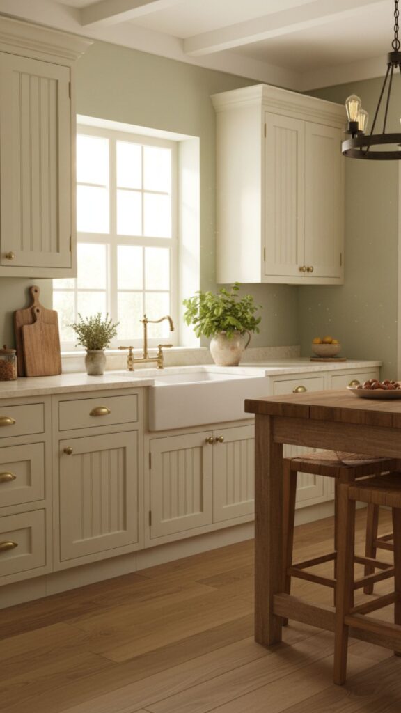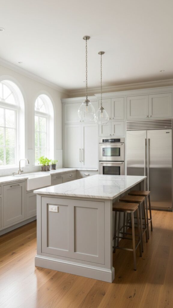 Semi-gloss or satin finishes are ideal. They reflect enough light to show off the details of the cabinetry but are durable enough to withstand scrubbing and cleaning, which is essential in a kitchen environment.