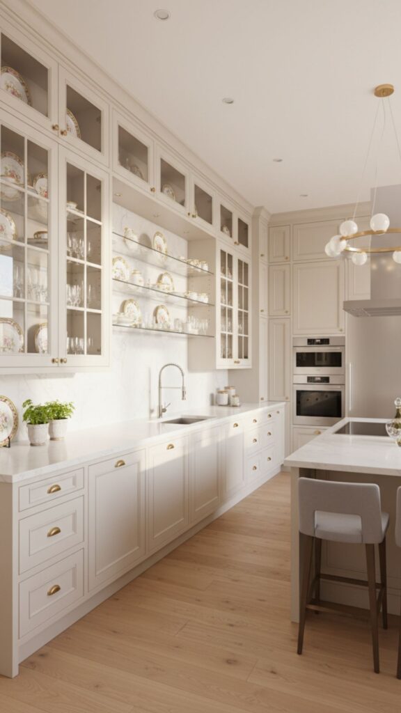 Glass-front cabinets break up the monotony of solid wood doors. They act as display cases for your favorite dishware and reflect light, making the kitchen feel brighter and more open.