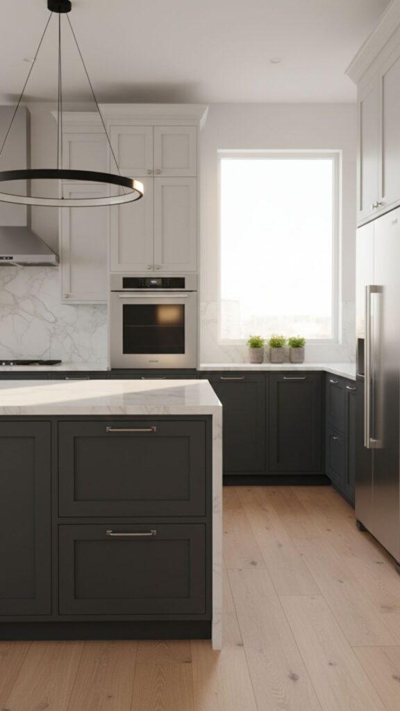 Can’t decide on one color? The two-toned look anchors the kitchen by using a darker color on lower cabinets and a lighter color (or white) on uppers. This creates visual weight at the bottom and airiness at the top.