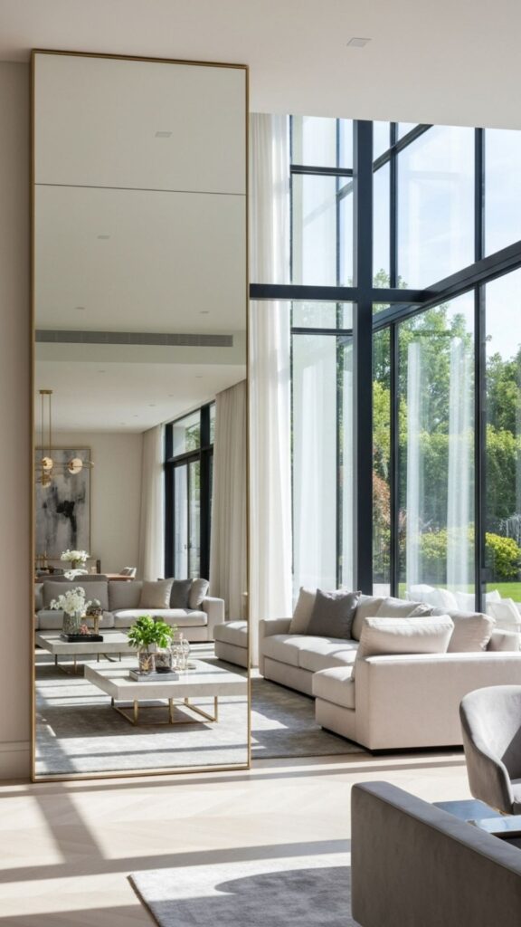 Interesting fact: Placing a large mirror opposite a window can double the amount of natural light in a room, instantly making it feel more open. For smaller living rooms, consider floor-to-ceiling mirrors or mirrored panels. Even a well-placed decorative mirror above a fireplace or behind a sofa can trick the eye into perceiving more depth.