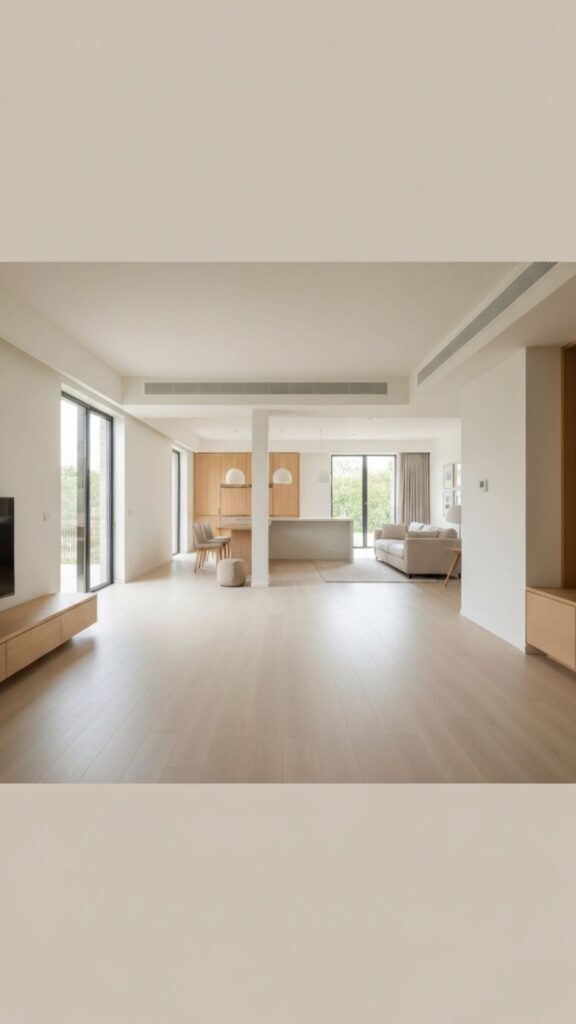 Pair this with floating furniture arrangements, like a centrally placed sofa or coffee table, to enhance the airy vibe.