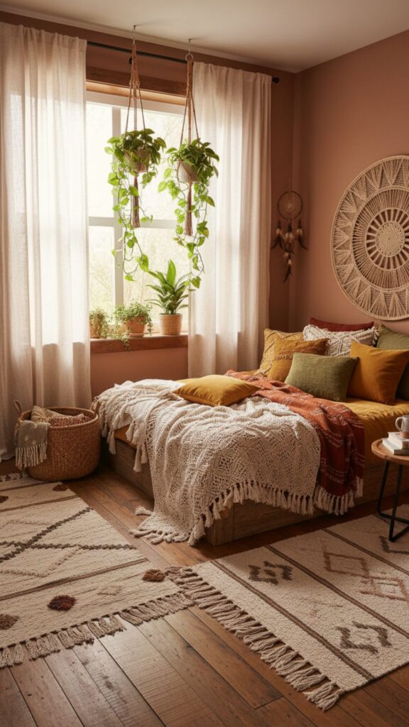 For those who find peace in nature and creative expression, the Earthy Bohemian style mirrors the grounding energy of the Root Chakra. This aesthetic uses layers of texture, plants, and warm, organic tones to create a cozy, “lived-in” atmosphere that feels nurturing and safe.