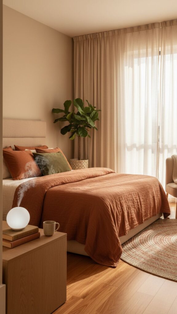 Based on the ancient Indian medical system, an Ayurvedic bedroom seeks to balance the Doshas. This style typically leans towards warm, spicy colors like terracotta, ochre, and saffron to create a cozy, womb-like environment that supports deep rest and rejuvenation.