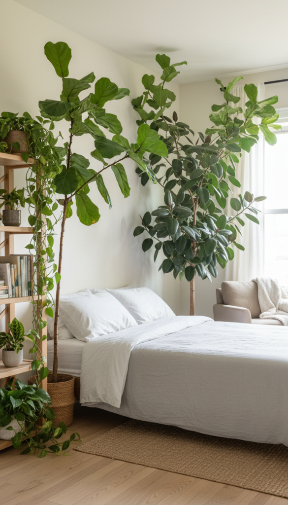 When it comes to the Urban Jungle aesthetic, plants are the stars of the show. For a truly jungle-inspired bedroom, incorporate statement plants such as tall fiddle-leaf figs, large rubber plants, or cascading pothos. These plants will add depth and height to your room, creating a lush, green backdrop that sets the tone for the rest of your decor.