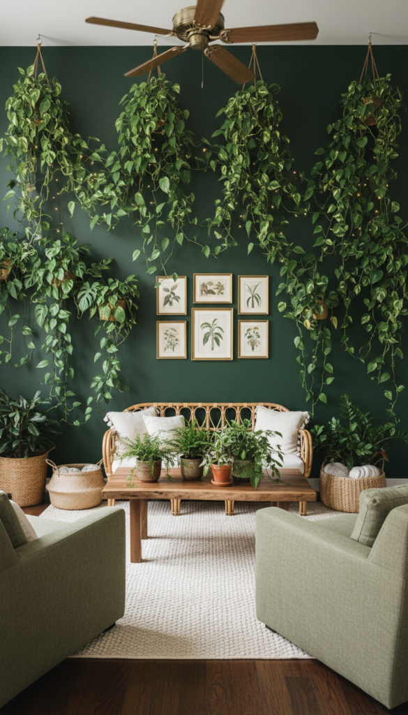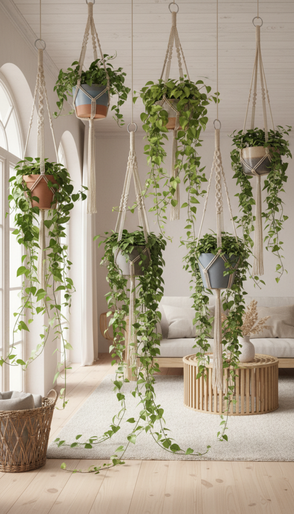 If you’re working with limited floor space, don’t worry—there’s still plenty of room for greenery! Hanging planters are a fantastic way to utilize vertical space and create a cozy jungle vibe. Opt for stylish macramé hangers or sleek modern planters suspended from the ceiling to display trailing vines or smaller potted plants.